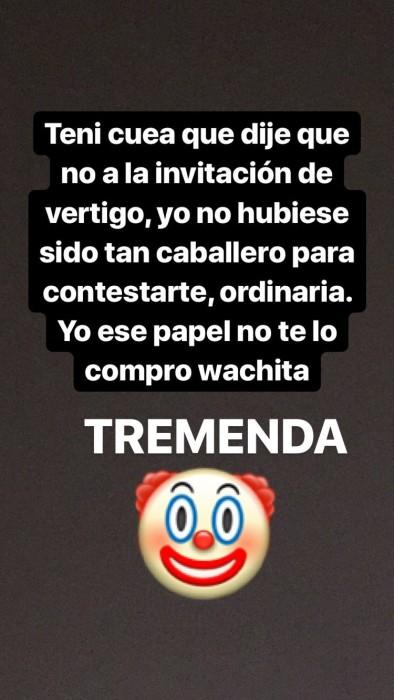 “Yo creo que hay que tomarlo de quien viene nomás. Obviamente yo creo que la discusión se excedió un poco. Las fotos hablan por sí solas. De ordinarieces yo creo que no hay que hablar mucho, más que hablar con eso", expresó al programa Intrusos y luego aseguró que está con la opinión de Carmen Gloria.