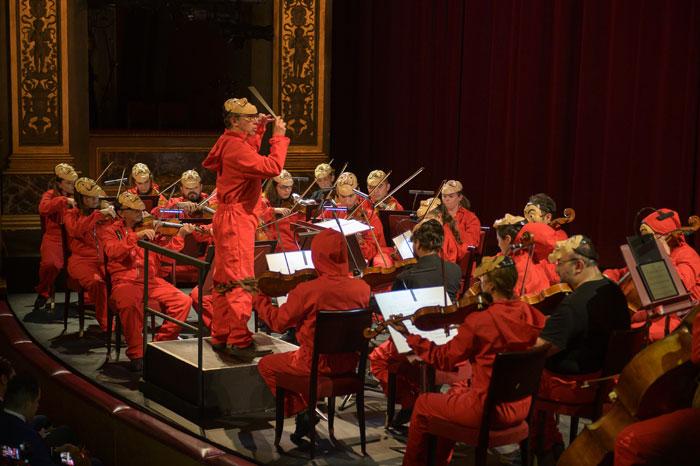 La sorpresa de la noche fue la llegada inesperada de los actores Pedro Alonso (Berlín) y Rodrigo de la Serna (Palermo), quienes ingresaron a la alfombra portando la icónica máscara de Dalí, infiltrándose en la foto del grupo, develando su presencia para completar el elenco presente en esta gran celebración. Una vez dentro del teatro, los presentes pudieron disfrutar de una presentación especial de “Bella Ciao” interpretado por una orquesta filarmónica de Bogotá vestidos con overol rojo y máscara de Dalí. Jesús Colmenar (Director) y Miguel Amoedo (Director de Fotografía) se unieron al elenco en el escenario para presentar los dos primeros episodios de La casa de papel parte 3 #LCDP3.