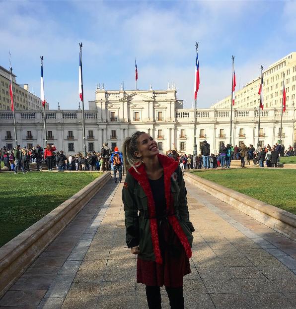 La modelo quiso jugar una vez más y aprovechando que está en Chile se tomó una foto en el Centro de Santiago, afuera de La Moneda. La descripción de la instantánea fue lo que causó opiniones contrarias: