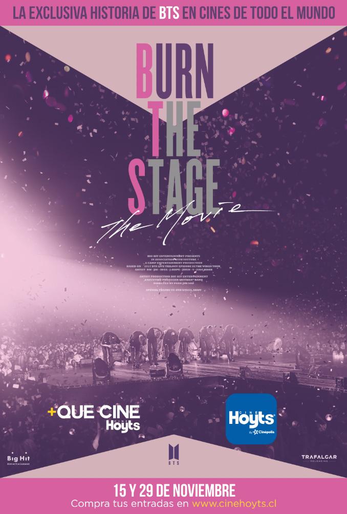 Con el objetivo de ofrecer una variada selección de propuestas diferentes a lo disponible en la cartelera comercial en Chile, + Que Cine de CineHoyts, presenta un título que sin duda llamará la atención de quienes gustan de escuchar, bailar y vibrar con el K-Pop, y sobre todo, a los fans de BTS, quienes serán los protagonistas de Burn The Stage: La Película.