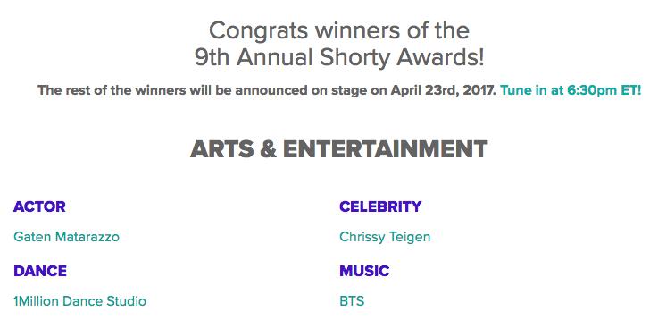 ¡Locura por BTS! La banda ganó en la categoría de música, en la novena ceremonia de los "Shorty Awards" que reconocen a las producciones y estrellas influyentes en social media: Twitter, Facebook, Tumblr, YouTube, Snapchat, Instagram, YouNow, Musical.ly, Vine y más.