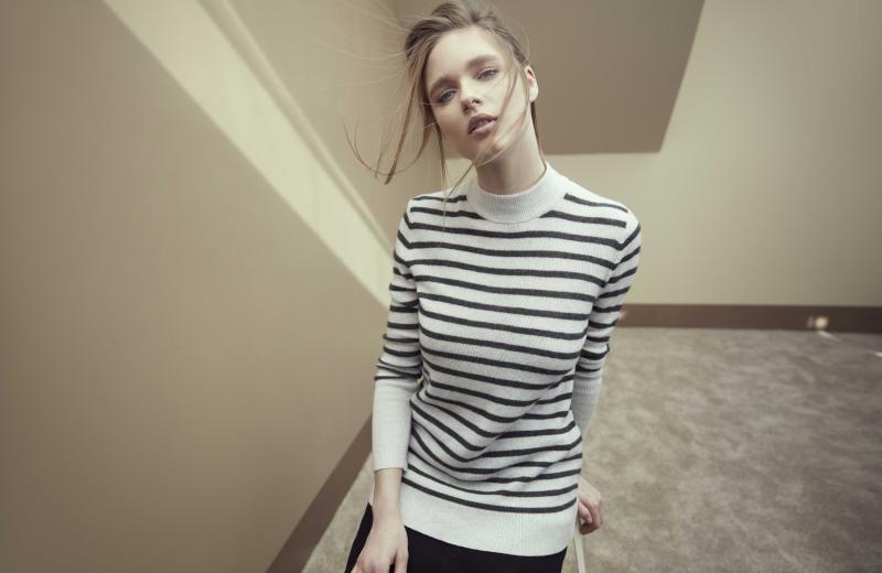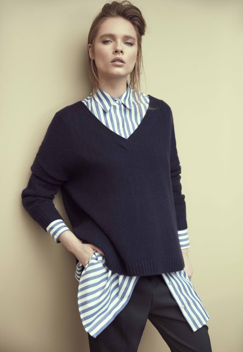 Finalmente, pero no por eso menos importante, te recomendamos tener un tercer chaleco de cachemira, pero esta vez, con algún diseño. Como no queremos que tengas la sensación de que el estampado o ciertos colores no los puedes repetir tanto, te aconsejamos que elijas un diseño de rayas más bien navy, el que te servirá tanto para ocasiones casuales como formales. En este caso además te aconsejamos usar un chaleco con cuello, el que te dará más elegancia y te hará ver más estilizada.