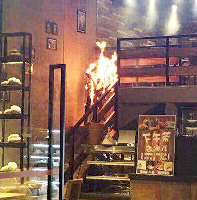 Daily Mail añadió que el incidente se registró en un lugar donde no hay cámaras, por lo que sólo existe registro del momento en que la joven baja envuelta en llamas por las escaleras de la cafetería.