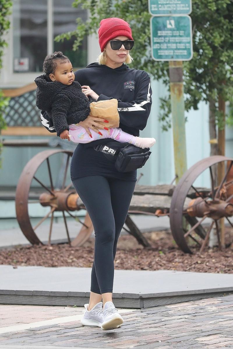 Curiosidad ocasiona una imagen de Khloé Kardashian reciente, cerca de su residencia en Los Angeles, mientras pasea en brazos a su hija True.