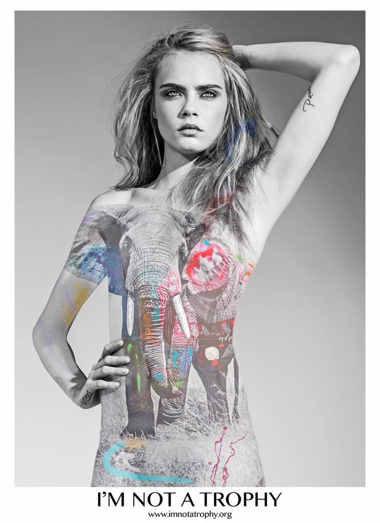 Cara Delevingne aparece desnuda y con su cuerpo estampado de especies en extinción. Este trabajo, del fotógrafo francés Arno Elías, pertenece a “I’m Not a Trophy”, en contra de la caza.