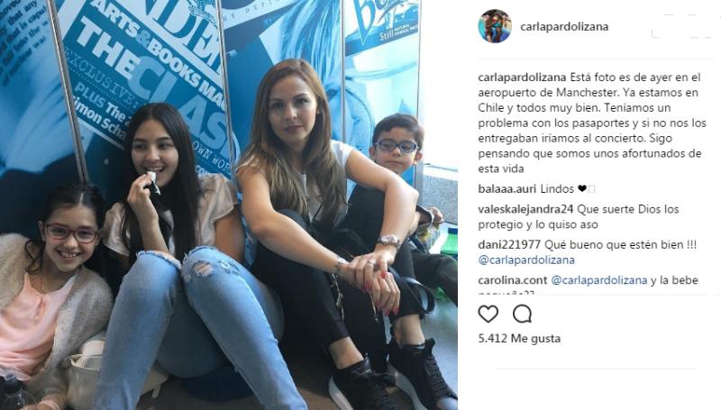 “Esta foto es de ayer en el aeropuerto de Manchester. Ya estamos en Chile y todos muy bien. Teníamos un problema con los pasaportes y si no nos los entregaban iríamos al concierto. Sigo pensando que somos unos afortunados de esta vida”, escribió.