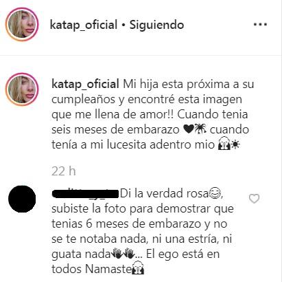 “Di la verdad rosa, subiste la foto para demostrar que tenías 6 meses de embarazo y no se te notaba nada, ni una estría, ni guata nada… El ego está en todos, Namaste”, escribió la cibernauta.