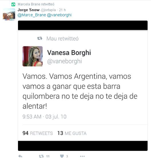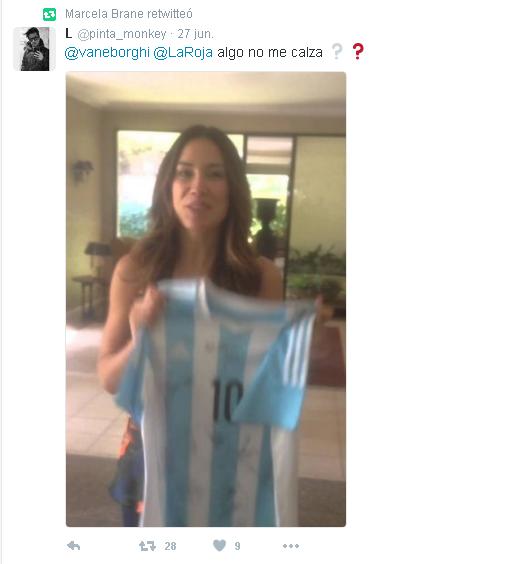 Un tuit tiene en el ojo del espectáculo a la guapa morena del tiempo Marcela Brane. La modelo y presentadora se mandó una opinión con nombre y apellido, recibiendo el apoyo de algunos fieles que se dieron el trabajo de tomar pantallazos a viejos tuits de Vanesa Borghi apoyando a la selección argentina.