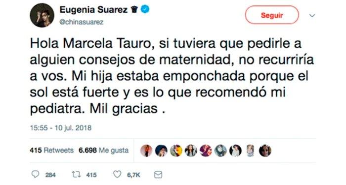 Tras esto, la pareja de Benjamín Vicuña desató su furia en Twitter. “Hola Marcela Tauro, si tuviera que pedirle a alguien consejos de maternidad, no recurriría a vos. Mi hija estaba emponchada porque el sol está fuerte y es lo que recomendó mi pediatra. Mil gracias”, respondió.