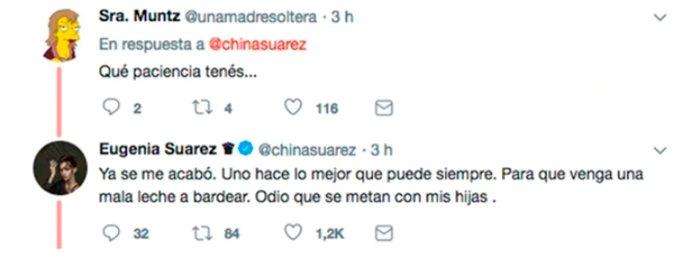 “Ya se me acabó (la paciencia). Uno hace lo mejor que puede siempre. Para que venga una mala leche a bardear. Odio que se metan con mis hijas”, añadió.
