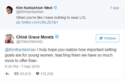 En marzo de este año, Kim Kardashian subió una foto a Twitter en la que aparecía casi completamente desnuda y la actriz Chloë Grace Moretz la criticó directamente. "Espero que sepas lo importante que es que le enseñes a las niñas que tienen mucho más que ofrecer que solo su cuerpo", le dijo a través de la misma red social.