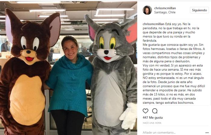 “En un comienzo viví este calvario sola, no quería ir a trabajar, sacarme fotos, salir o simplemente juntarme con mis amigos porque me daba vergüenza y no me quería a mí misma. Desesperada recurrí a una maravillosa, empática y comprensiva doctora. Me mandó exámenes y el resultado reveló que estaba comenzando con un hipotiroidismo. Estamos trabajando en ello..”, cuenta Chriss en un largo texto que subió junto a una foto, y en el que además cuenta que no lo ha pasado nada de bien.