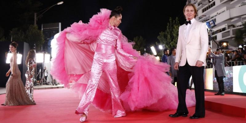En la alfombra roja de Viña, Di Mondo no pasó desapercibido. Y era bastante difícil que lo hiciera, considerando que eligió un traje de satín rosado y una capa de tul del mismoc olor que medía 6 metros.