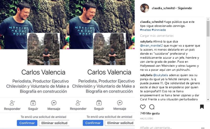 Sin entregar detalle, lo que le critican sus seguidores, Schmidt acusa al hombre de estar obsesionado con ella. A su comentario agregó el hashtag #metoo, que es el que se ocupa a la hora de hacer pública estas denuncias.