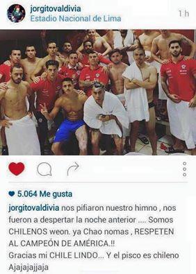 Jorge Valdivia se fue en contra de los peruanos que no les ofrecieron el respeto que según él alega, merecen. “Nos pifiaron nuestro himno, nos fueron a despertar la noche anterior… Somos CHILENOS. Ya chao nomás, RESPETEN AL CAMPEÓN DE AMÉRICA!!”, es parte del mensaje que escribió en redes sociales.