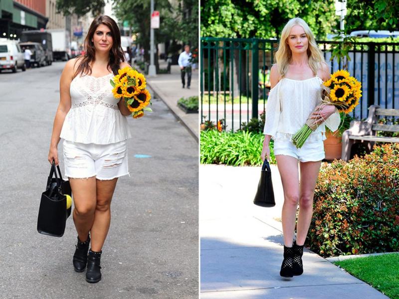 Katie Sturino se toma las mismas fotos paparazzis de famosas figuras de la moda y Hollywood.