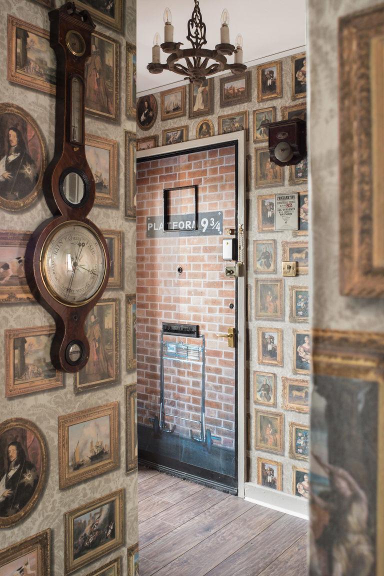 La puerta de entrada recuerda a la plataforma 9 ¾ de la estación King´s Cross y los pasillos simulan las pinturas del colegio.