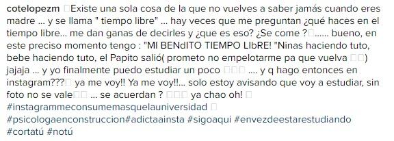 La ex figura de TV también se refirió a lo que estaba haciendo en ese momento para explicar su postura. “En este preciso momento tengo: Mi bendito tiempo libre”, ya que sus hijos estaban durmiendo y su esposo había salido, por lo que pudo ponerse a estudiar.