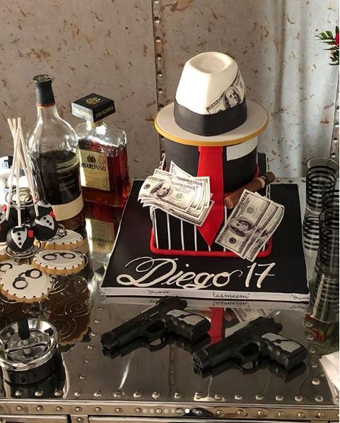 El festejo estuvo marcado por el estilo “gángster”, con una torta decorada con dólares, pistolas de juguete y pasteles con diseños de esmoquin.