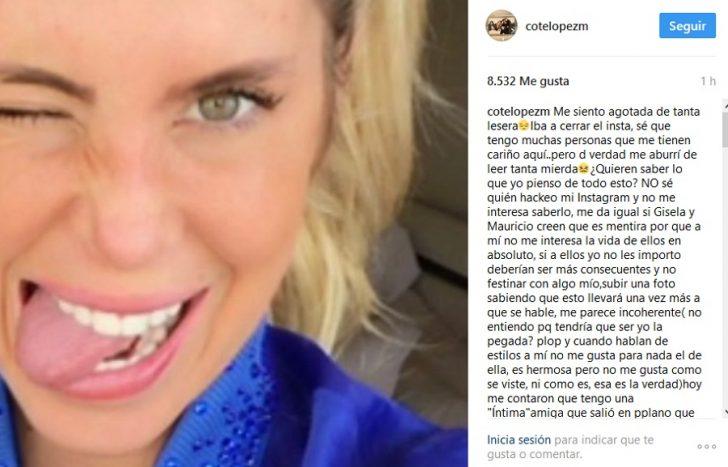 "NO sé quién hackeo mi Instagram y no me interesa saberlo, me da igual si Gisela y Mauricio creen que es mentira por que a mí no me interesa la vida de ellos en absoluto, si a ellos yo no les importo deberían ser más consecuentes y no festinar con algo mío", señaló y luego profundizó en su opinión sobre Gisela.