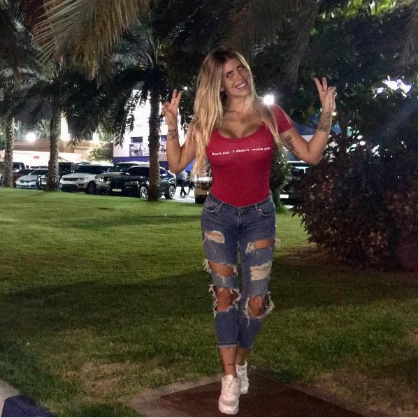 La modelo luce estupenda en un body rojo y jeans rasgados.
