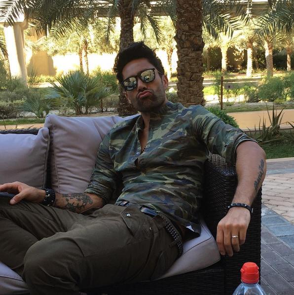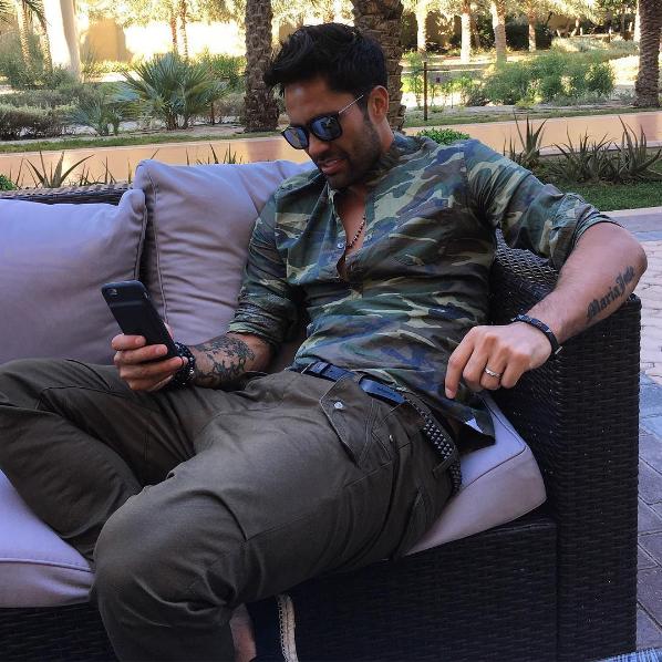 El futbolista luce un look militar, con los colores y las formas icónicas en la camisa. Como accesorios usa una pulsera y cinturón con tachas.
