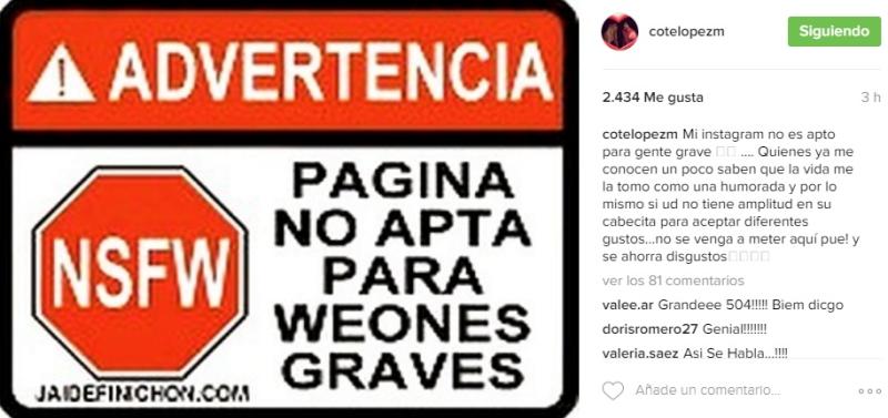 “Mi instagram no es apto para gente grave (…) Quienes ya me conocen un poco saben que la vida me la tomo como una humorada y por lo mismo si ud. no tiene amplitud en su cabecita para aceptar diferentes gustos...no se venga a meter aquí pue! y se ahorra disgustos”, escribió la joven.
