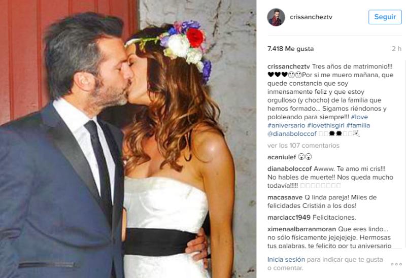 Sánchez escribió este romántico y tierno mensaje para acompañar la foto “¡Tres años de matrimonio! Por si me muero mañana, que quede constancia que soy inmensamente feliz y que estoy orgulloso (y chocho) de la familia que hemos formado… ¿Sigamos riéndonos y pololeando para siempre! #love “aniversario #lovethisgirl #familia @dianaboloccof”