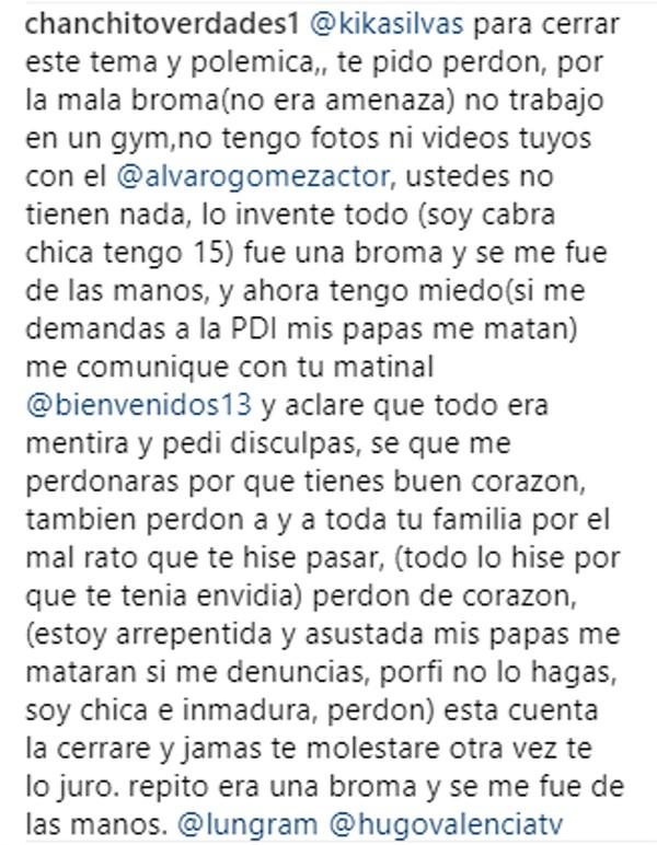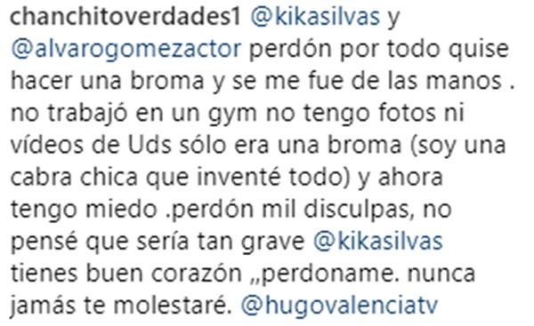 El usuario amenazó a Kika con difundir las imágenes si ella no asumía el romance, a lo que la rubia muy enojada le respondió que lo denunciaría si seguía amedrentándola. Tras el aviso de demanda, el usuario reveló su identidad al panelista de ‘Bienvenidos’ Hugo Valencia, y aseguró ser una niña de 15 años y que habría inventado todo.