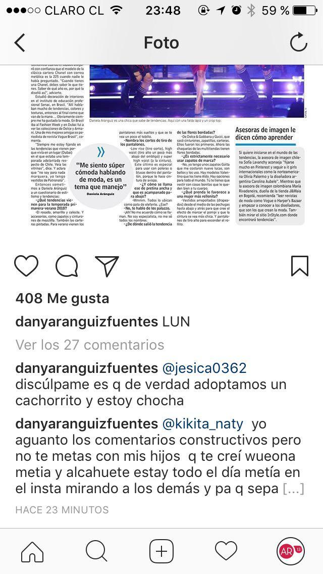 En medio de una de las tantas publicaciones en Instagram de Daniela Aránguiz, uno de sus "seguidores" o haters, criticó a sus hijos.