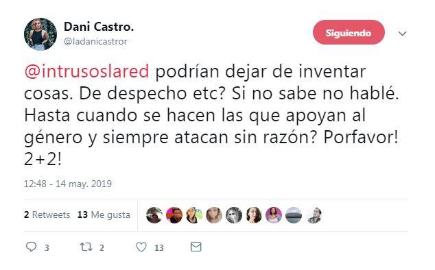 "¿Podrían dejar de inventar cosas, de despecho, etc? Si no sabe, no hable ¿Hasta cuándo se hacen las que apoyan al género y siempre atacan sin razón? ¡Por favor! 2+2", escribió Castro.
