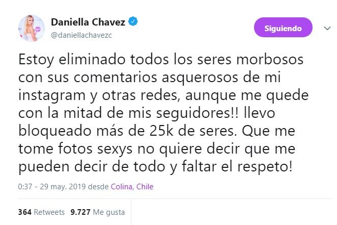 Daniella Chávez es la chilena con más seguidores en Instagram (11 millones) y su cuenta le ha traído varios dolores decabeza a la conejita playboy quien se ha descargado constantemente por los ataques que recibe por parte de usuarios, muchos de ellos mujeres.