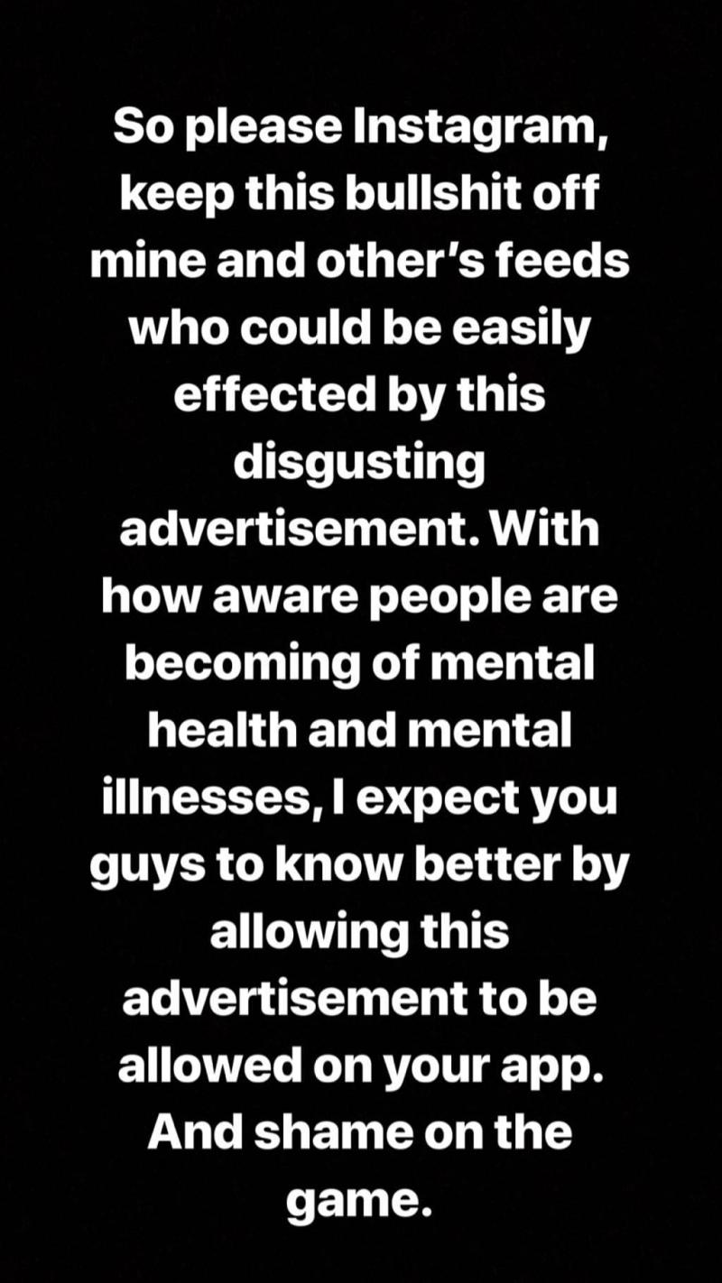 "Por favor Instagram mantén esta mierda lejos de mi y de otras personas quienes pueden verse afectadas facilmente por esta estupida publicidad. Teniendo en cuenta cuantas personas tienen problemas mentales de salud, espero que sepan elegir mejor qué permitir en la aplicación", finalizó.