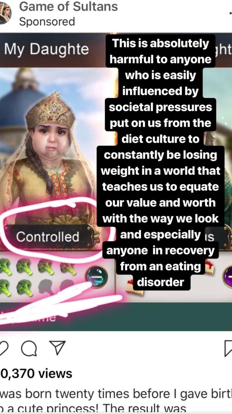 "Esto es absolutamente dañino para cualquier persona que sea fácilmente influenciada por las presiones sociales que nos pone la cultura de la dieta, a estar perdiendo constantemente peso en un mundo que nos enseña a equiparar nuestro valor con la forma en que nos vemos y, especialmente, cualquier persona en recuperación de un desorden alimenticio", añadió.