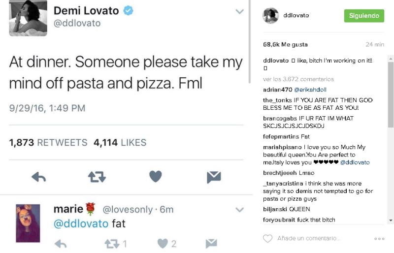 Quien se superó una vez más fue Demi Lovato y decidió responderle a una jovencita que la llamó "gorda". En Twitter la intérprete se desahogó a la hora de almuerzo, ansiosa por probar un poco de pizza o pasta, cuando llegó el desubicado comentario.