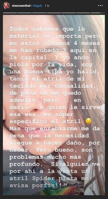 “Más que enrabiarme, me da pena que la necesidad llegue a hacer daño, por hacer. Pero bueno, son problemas mucho más profundos. Si alguien ve por ahí a la venta un atril Spider plata ¡¡me avisa porfis!!”, fue su llamado.