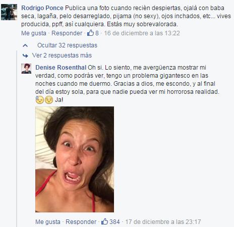 Denise Rosenthal le respondió con foto a fanático que la trató de “sobrevalorada”