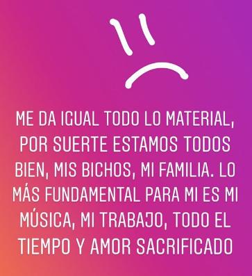 "Me da igual todo lo material, por suerte estamos todos bien, mis bichos, mi familia. Lo más fundamental para mí es mi música, mi trabajo, todo el tiempo y amor sacrificado", expone en la segunda publicación de sus historias.