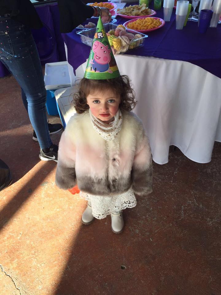 La pequeña estaba feliz con la temática del cumpleaños, y además se veía como una princesa con un vestido blanco, una pequeña tiara, y un abrigo peludo, muy a la moda.