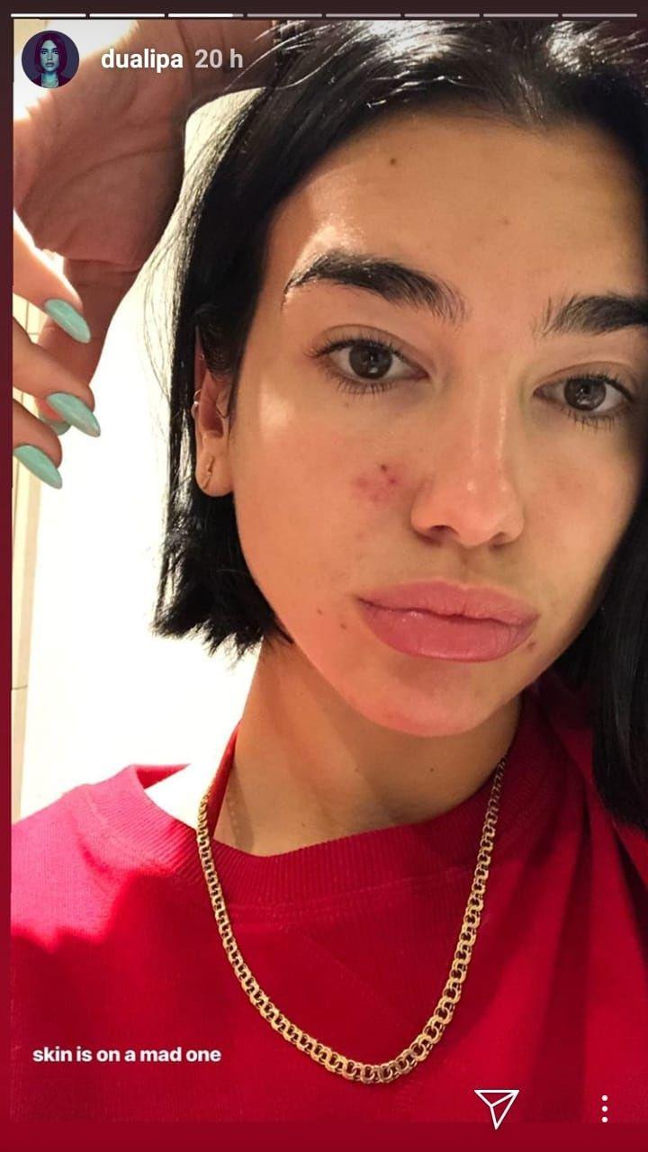 Una de las últimas en sumarse es nada más ni nada menos que la intérprete de "New Rules", Dua Lipa. “Mi piel está enojada”, escribió junto a la fotografía donde deja ver su rostro con imperfecciones y cien por ciento libre de maquillaje.
