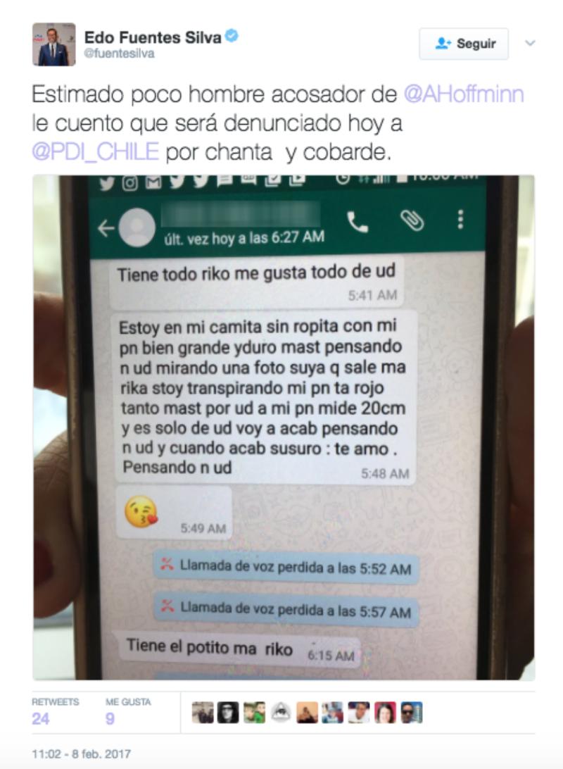 Hoffmann contó lo sucedido a su amigo Eduardo Fuentes quien difundió el pantallazo del repugnante texto y aseguró que la PDI se hará cargo de la investigación para dar con la identidad del sujeto: