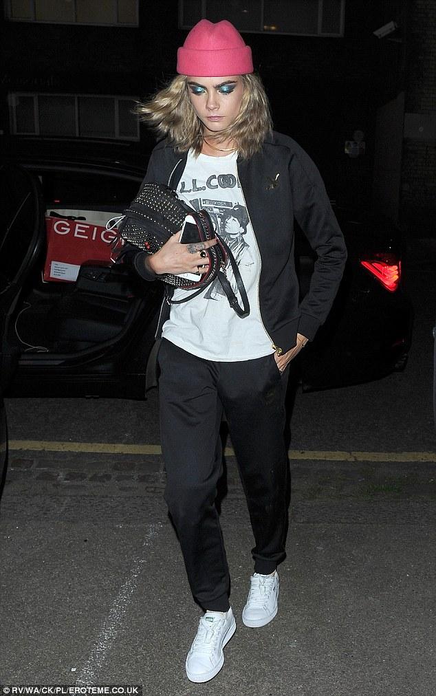 Para la ocasión, Cara eligió llegar con un relajado look que consistía de un buzo, zapatillas, una polera blanca, una bomber jacket negra y un gorro rosado, todo combinado con un maquillaje bastante intenso.