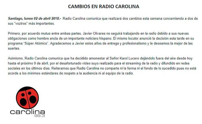 Cabe destacar que en la misiva también se manifiesta la salida definitiva de Javier Olivares de la estación radial justificando su salida en que el periodista tendría otras obligaciones. Descartando de plano que su desvinculación tuviera como motivo la crítica que realizó a su colega Karol Lucero tras la polémica.