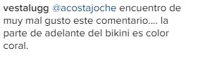 Se trata de una mancha roja en la parte de debajo de su bikini, que muchos asociaron a su periodo menstrual. Pero ella rápidamente respondió a esos comentarios, asegurando que es la parte de adelante del calzón, que es color coral.