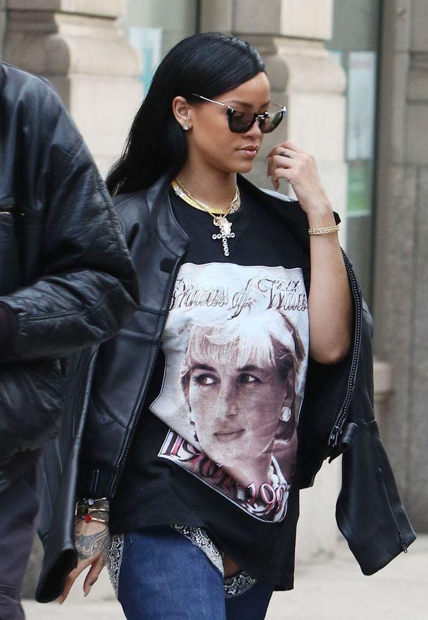 Últimamente, las poleras grandes y con estampado son las favoritas de Rihanna, que hace unos días usó un look similar pero más casual para pasear con Nueva York. En esa ocasión, el enorme top tenía impresa la cara de la Princesa Diana de Gales, que acompañó con una chaqueta de cuero y jeans.