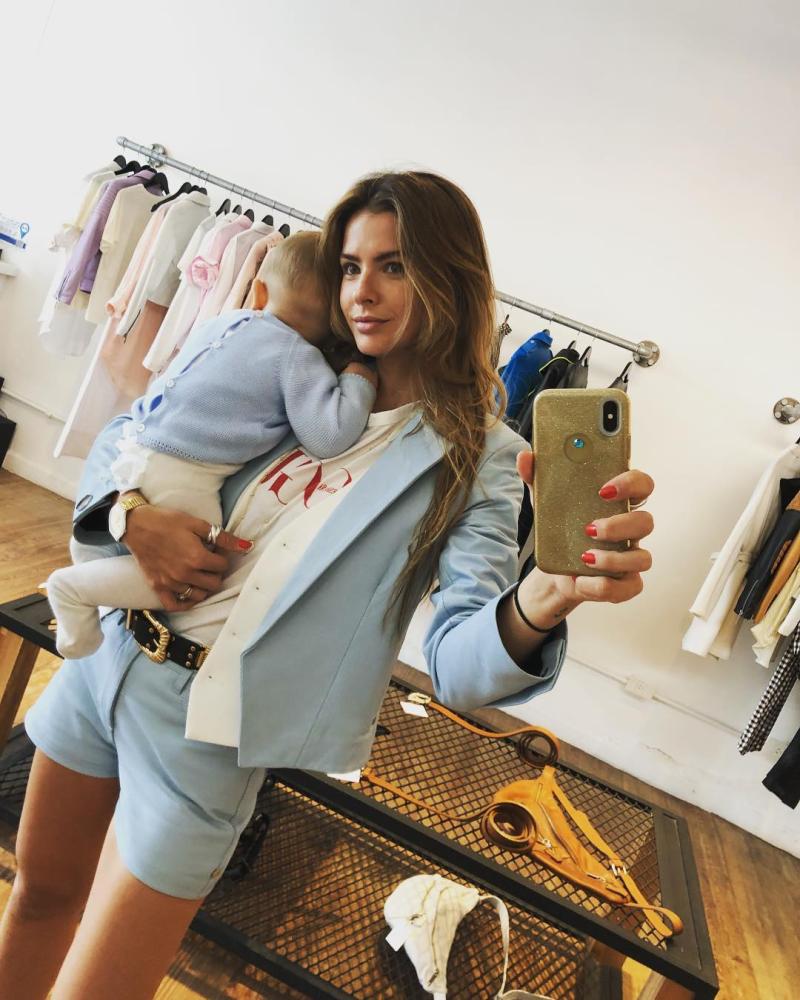 La actriz por su parte lleva un traje veraniego de dos piezas en celeste pastel y una polera blanca con letras espantadas, mientras que la pequeña viste un clásico conjunto infantil con los mismos tonos.