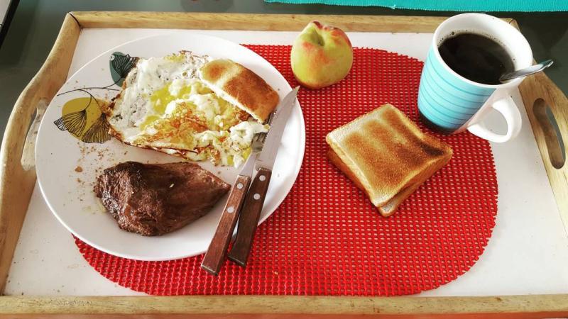 Gonzalo Egas, luchador de Todo Vale, comienza su día con tremendo desayuno. "De campeones", lo describe en redes sociales, pero más que obedecer a este concepto lo que sucede con la primera comida del día del ex chico reality es que es bastante inusual. Una mezcla de huevos, carne asada y pan sorprende a sus seguidores. Junto al plato, un café y una manzana complementan la imagen.