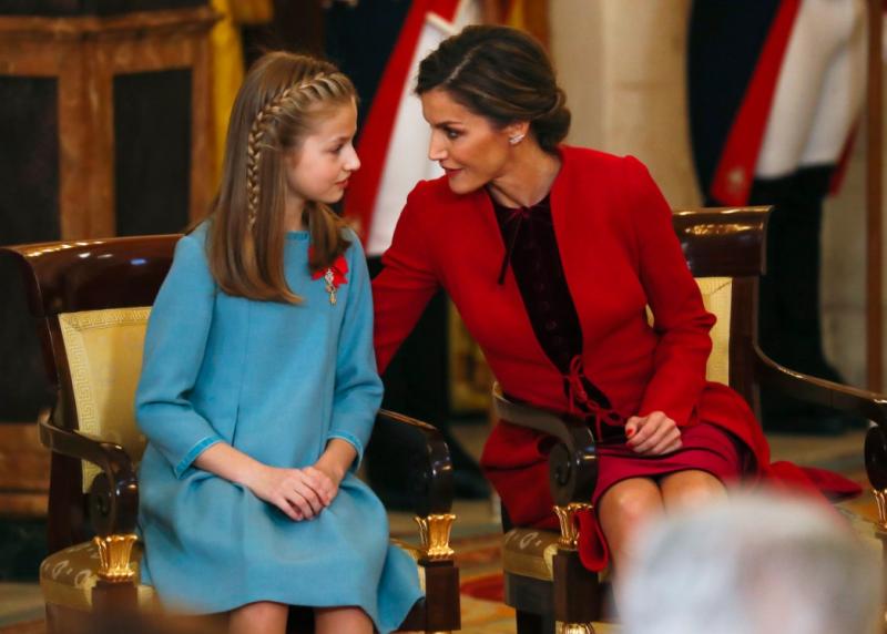 Por su parte, la reina Letizia usó un abrigo rojo que cubría su traje de Felipe Varela, los que combinó a la perfección con sus zapatos de Lodi y aros de Gold&Roses.