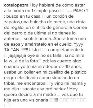 A modo de anécdota, Cote contó que “tenía alrededor de 10 años, usaba un collar en mi cuellito de plástico negro elasticado como simulando un tribal, me encantaba (…) Y vino mi mamá y me dijo: Sácate esa ordinariez. Hoy quiero decirle a mi madre...Ves que tu hija era una visionaria”.