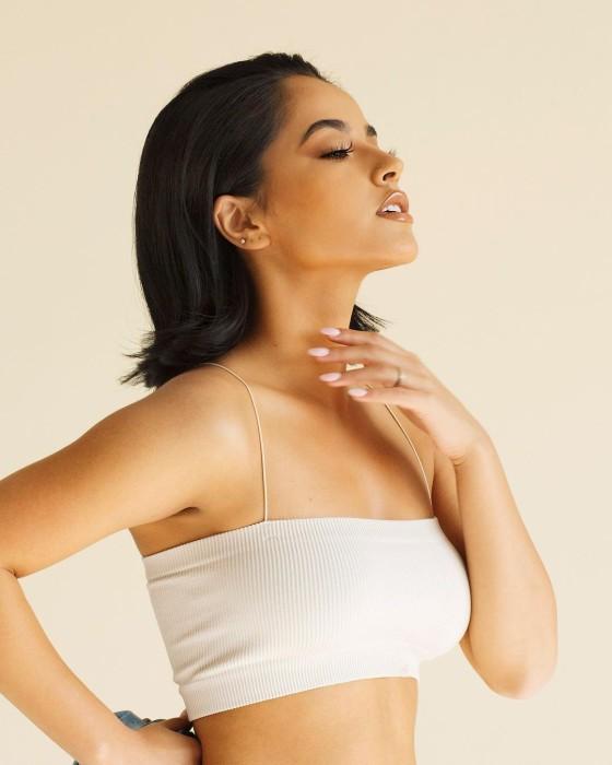 Como ves, en ellas Becky G luce su esbelta figura en un traje blanco con el que muestra un cuidado topless. Su cabello luce con volumen, hacia un costado, como no estamos acostumbrados a verla.